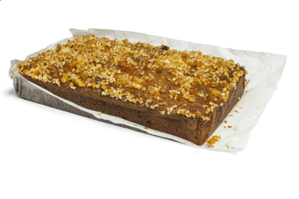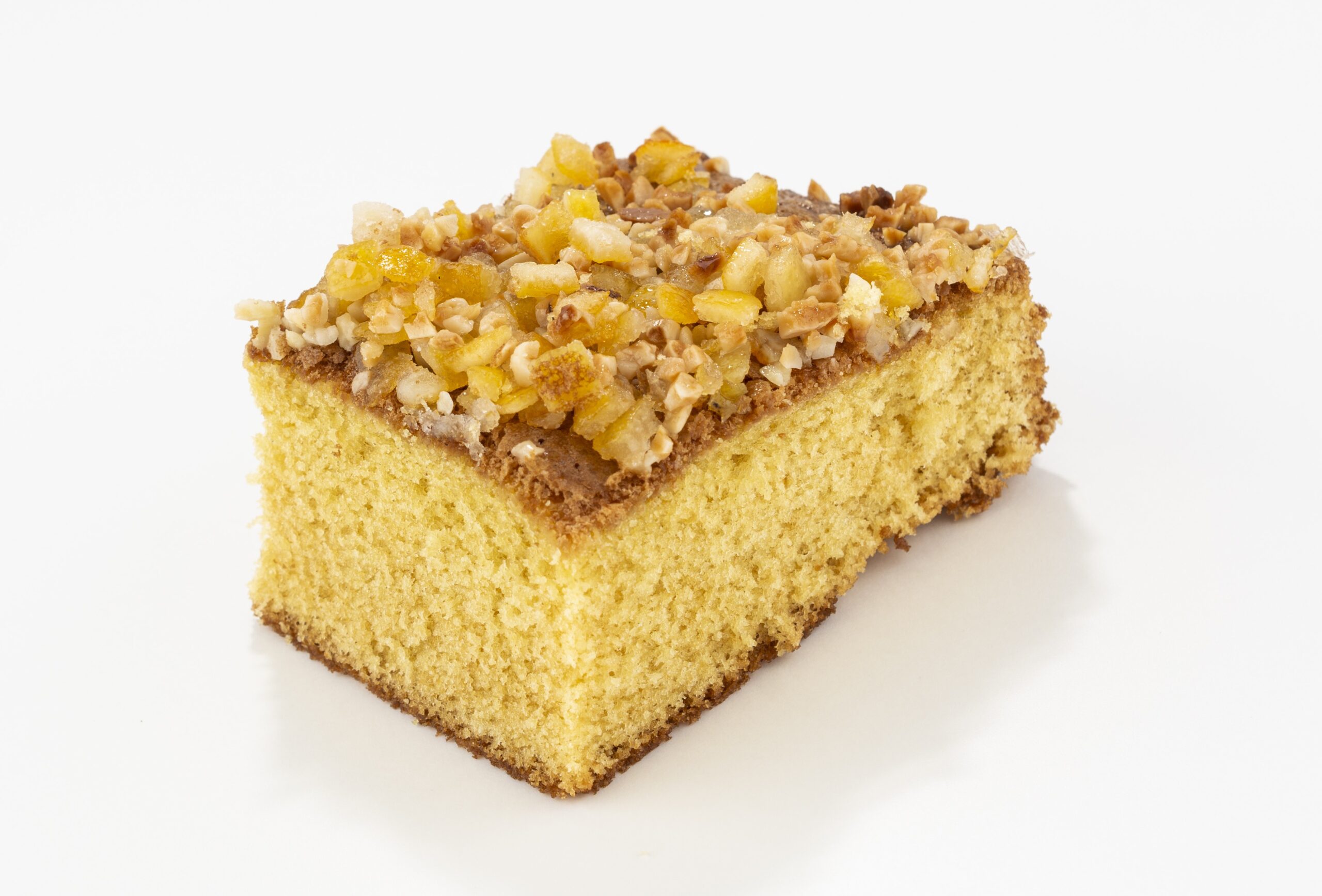 Delicioso Bizcocho de naranja cubierto de almendra y naranja escarchada.